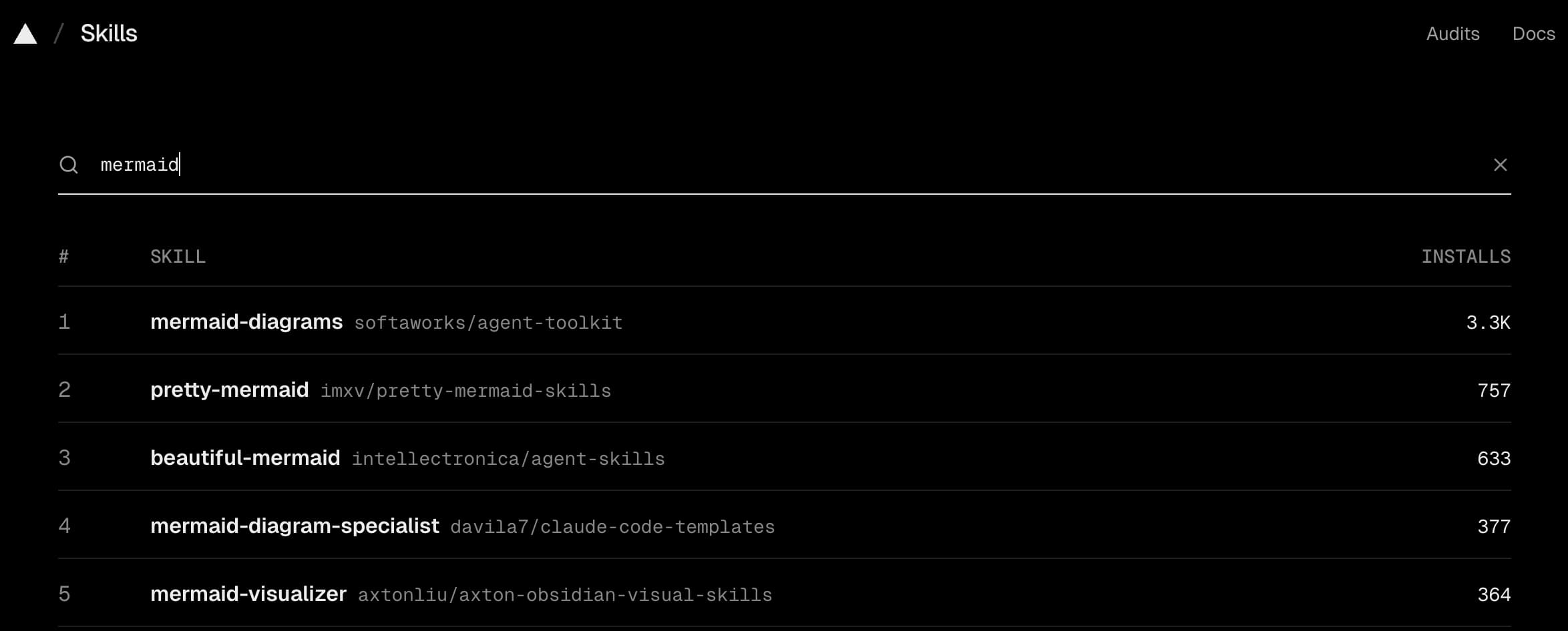 例えばここでMermaidのAgent Skillsを検索すると、以下のように様々なスキルが確認できます。