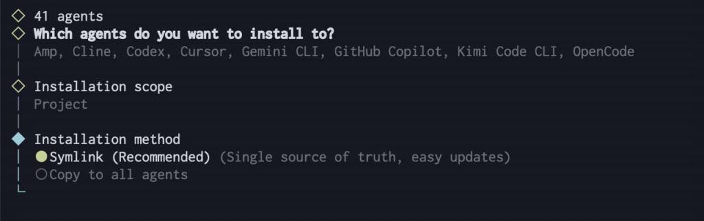 私は今回 Cursor を利用するので、 ./agent/skills の方を選択します。