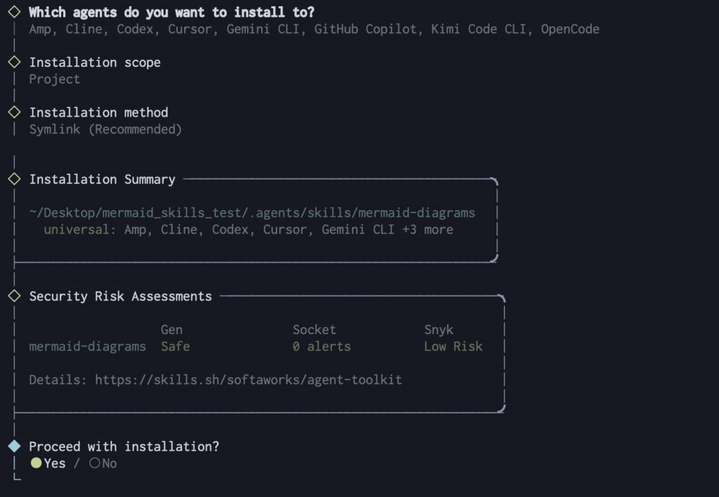 npx skills add https://github.com/softaworks/agent-toolkit --skill mermaid-diagrams