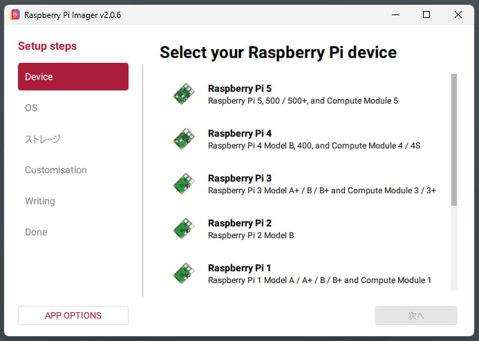 Raspberry Pi Imagerのインストールが完了したら、起動して今回書き込むRaspberry Piのデバイスの種類を選択します。