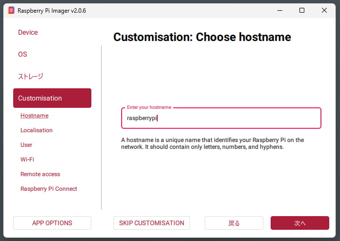 まずホスト名になりますが、今回は単純に「raspberrypi」とします。