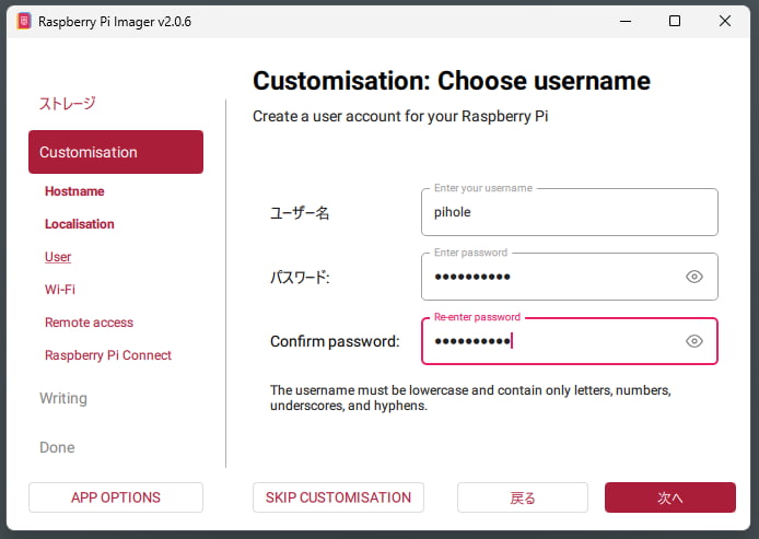 ご自身のお好きなものを設定して下さい。(今回手元の環境ではユーザ名は単に「pihole」としました)