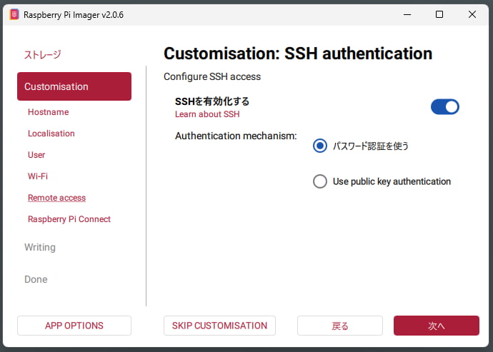 次のリモートアクセスについてはSSHの有効可を行っておきます。