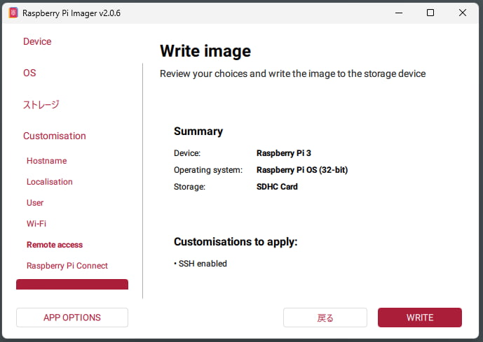 最後にこれまでの設定を確認し、『Write』ボタンを押します。