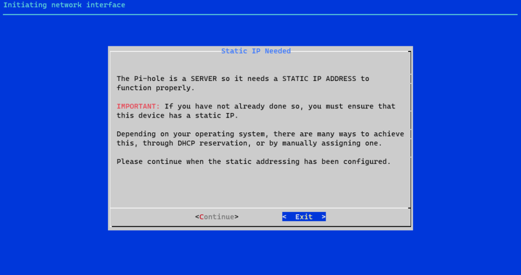 $ curl -sSL https://install.pi-hole.net | bashインストール途中で静的IPの設定有無について確認する画面が出ます。