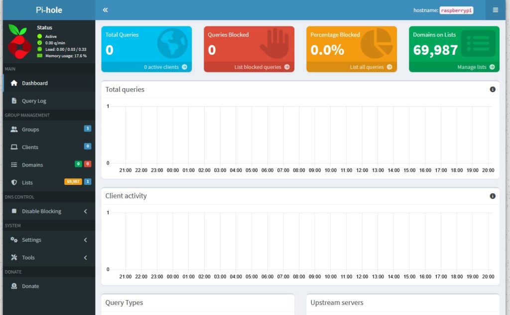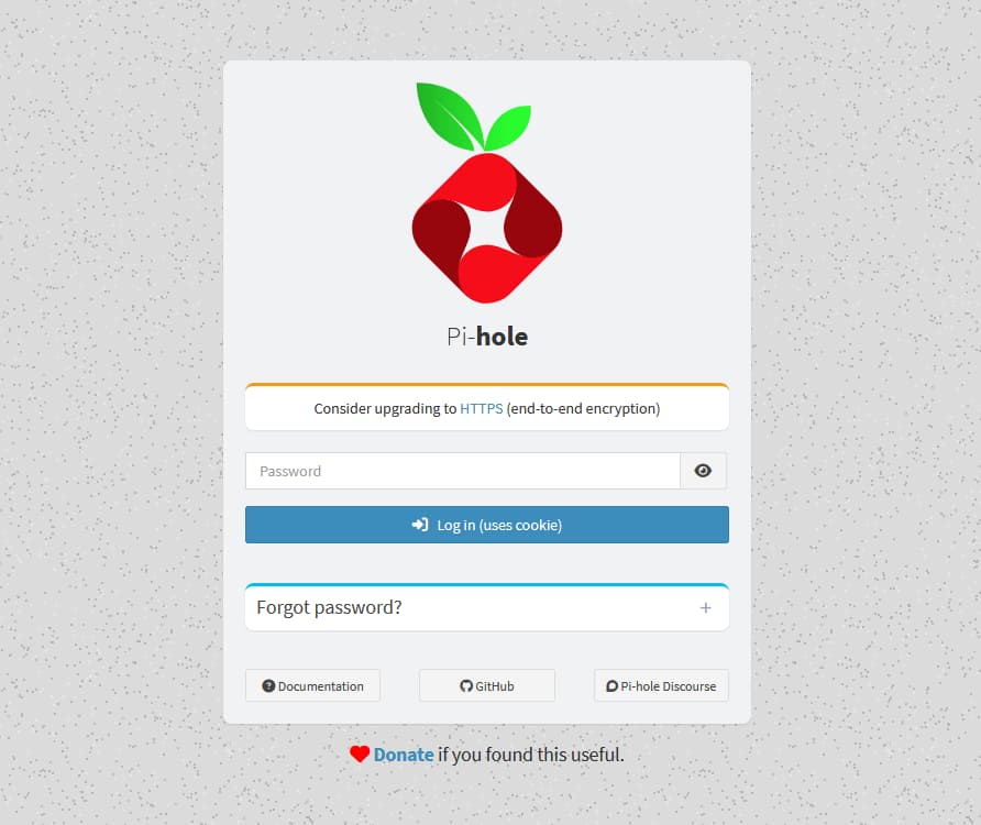 インストールが成功していると、http:<Raspberry PiのローカルIP>:80/adminにアクセスすると、以下のような画面が表示されるかと思います。