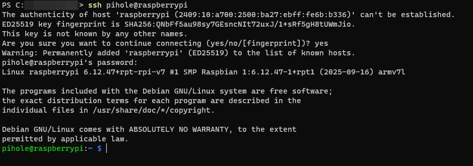 $ ssh pihole@raspberrypi接続できたら以下のように、 指定したユーザー名でのセッションが確立できると思います。