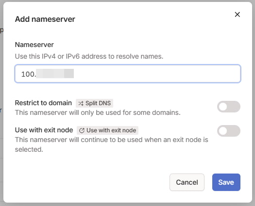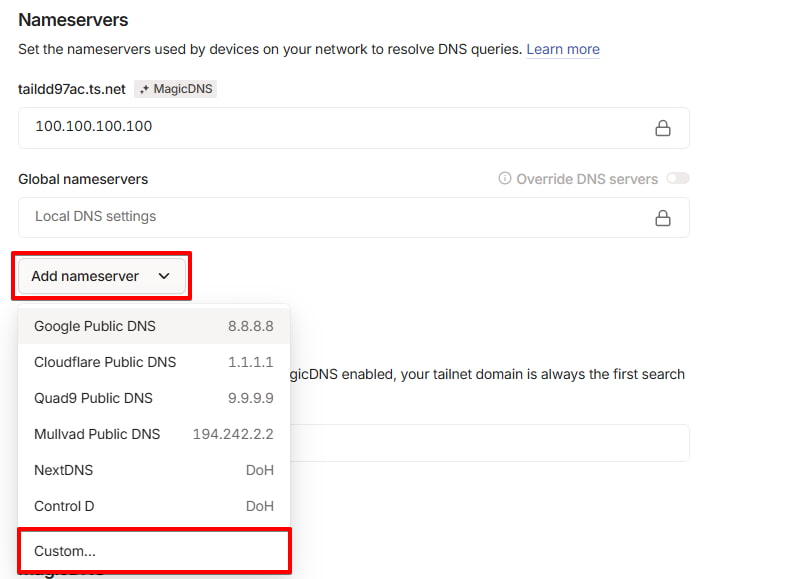 Tailscaleの管理コンソールの『DNS』に移動し、 『Nameservers』セクションで『Add nameserver』を選択し、『Custom』を選択します。