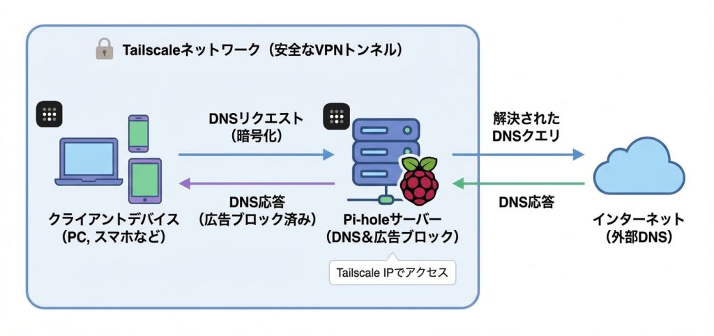Pi-holeとTailscaleを組み合わせることで、外出先からでも自宅のPi-hole経由でインターネットにアクセスし、広告ブロックの恩恵を受けられるようになります。